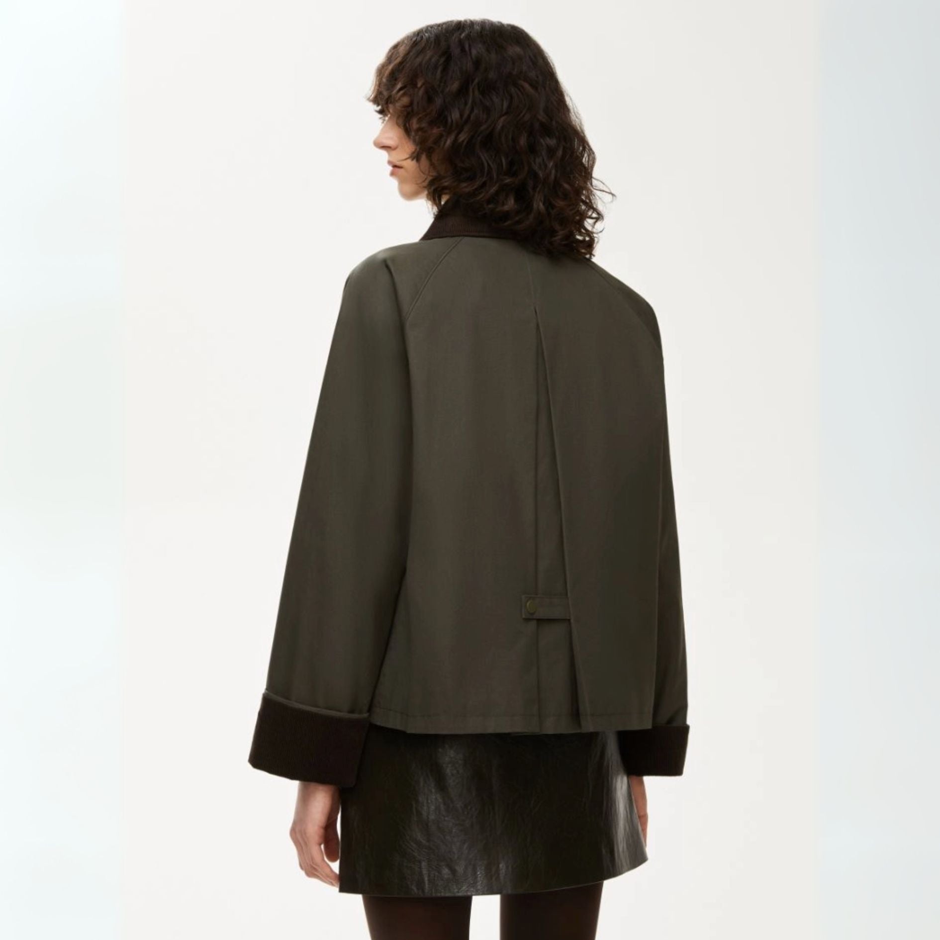 - Rib-knit velvet collar and turned-up cuffs, in addition to a central inverted pleat, buttoned strap detail and a lined design