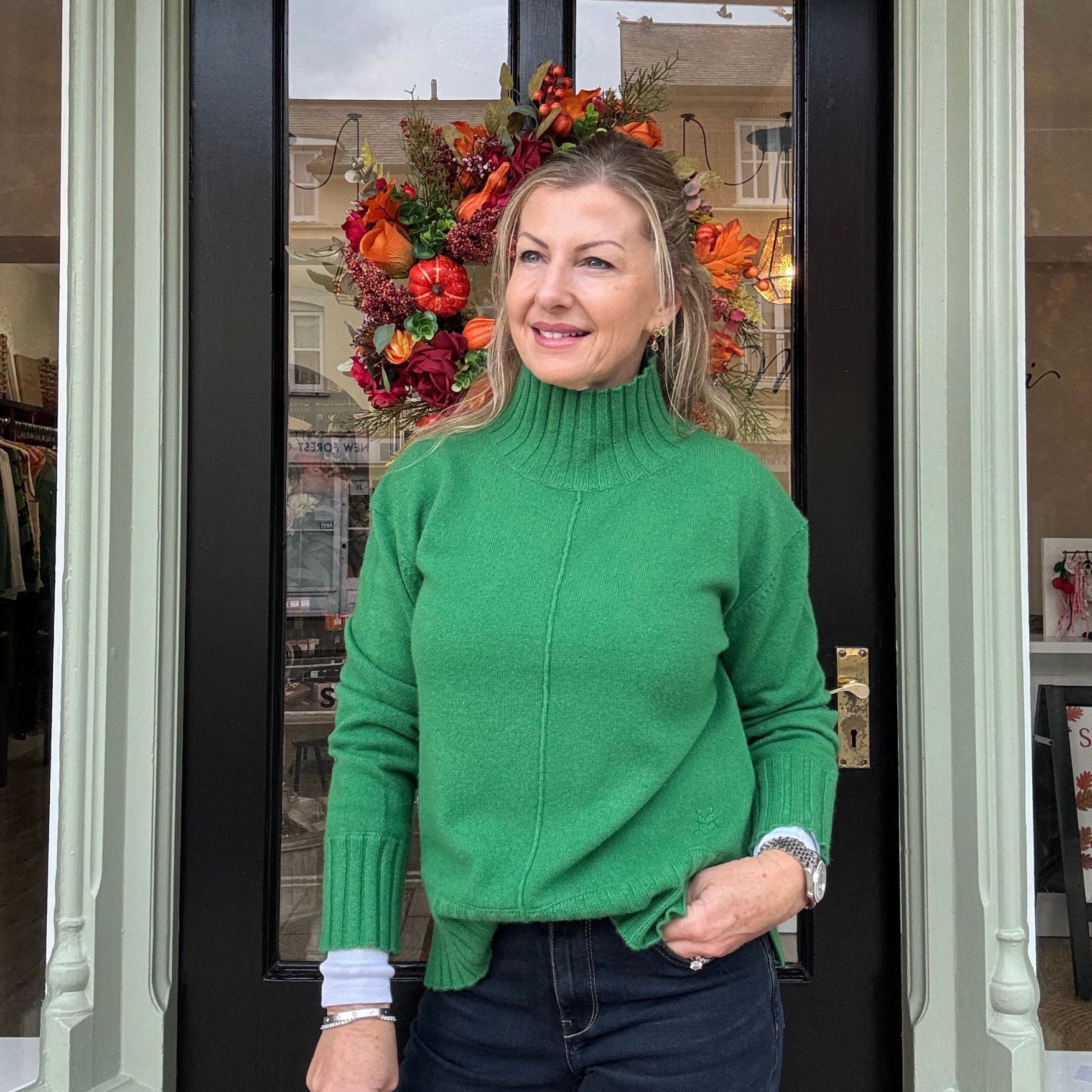 Stay warm this season with this cashmere and wool knit. It has a slightly oversize fit and is finished with ribbed details on the high neck, cuffs, and bottom hem, and a raised seem detail down the front. It has a slit on each side, giving it aperfect fit to wear with wide leg jeans.