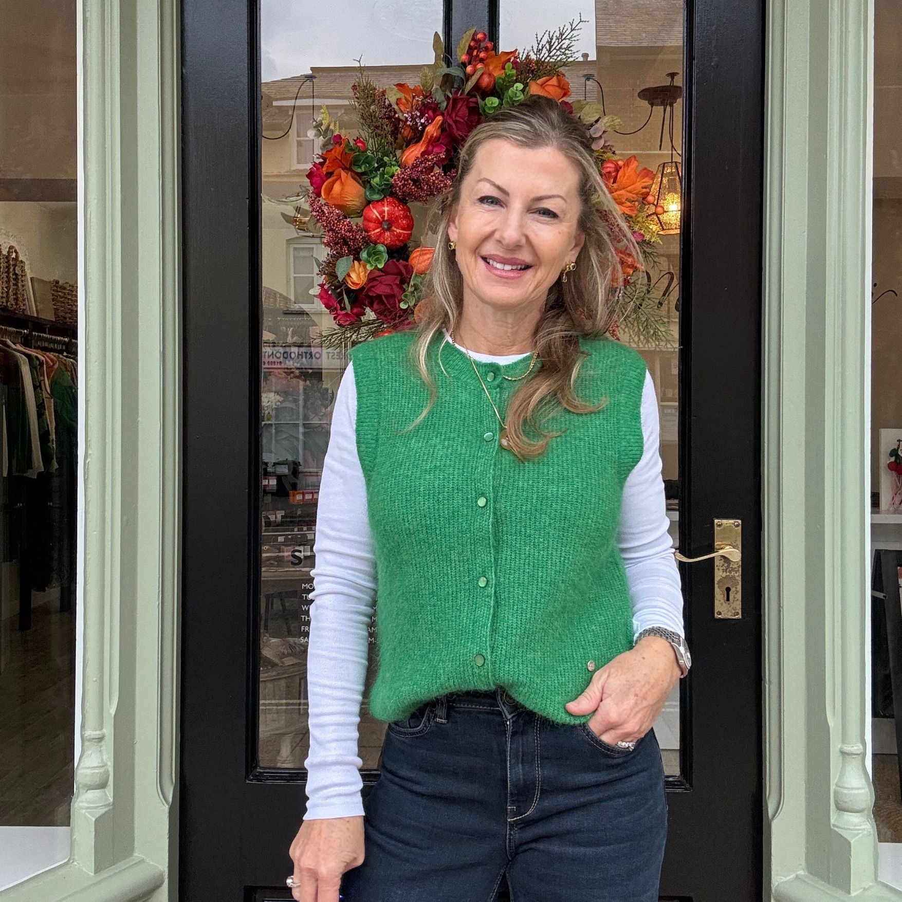 Soft knit vest crafted from a blend of warm wool and alpaca. It's designed in a regular fit with a beautiful button closure. Wear over a shirt, a dress or with tailored pants for a casual work look.